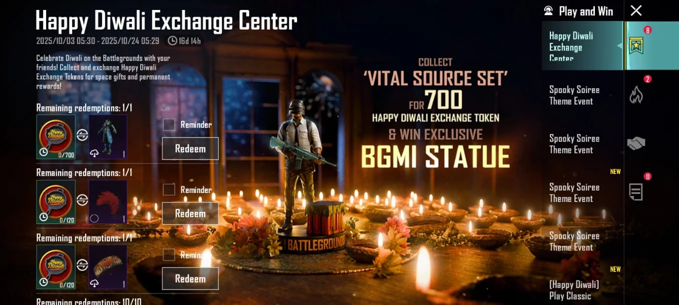 This event follows right after the Spooky Soiree Theme Event, which began on September 30 and will continue until November 5, 2025. While both events offer similar gameplay mechanics for earning and redeeming rewards, the Diwali event stands out for its more eye-catching items and vibrant theme.