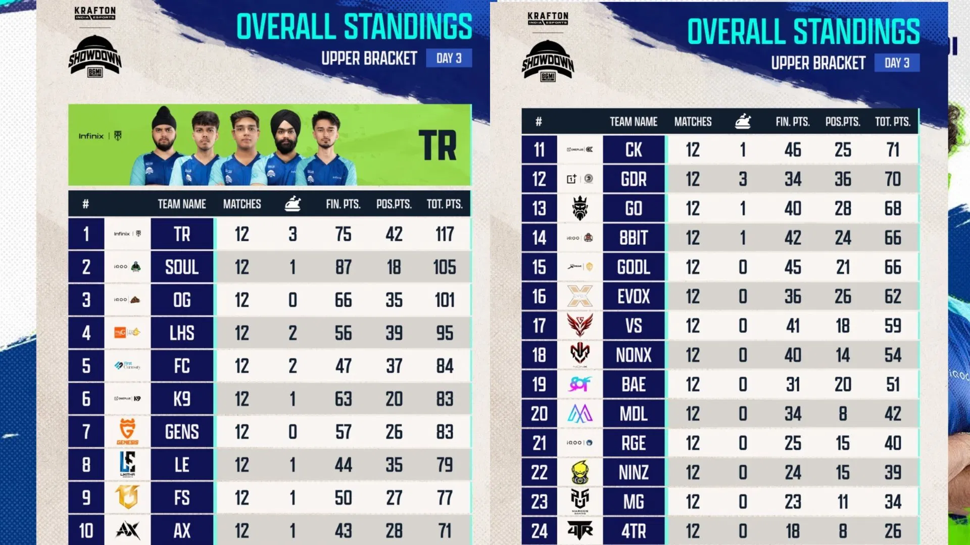 Likitha Esports were one of the big gainers of the day, jumping up the table after some smart rotations and a crucial win. On the other hand, 4TR struggled again and remained at the bottom with only 26 points.