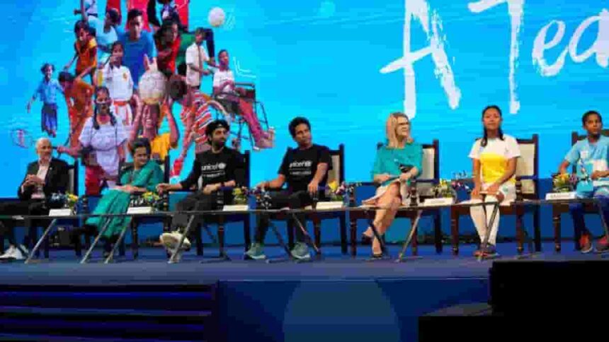 A team of 20 children played a friendly futsal football match with UNICEF Regional Goodwill Ambassador Tendulkar and UNICEF’s Celebrity Advocate Ayushmann Khurrana. Nearly a hundred children rendered an art performance creatively depicting unity in diversity, inclusion and equality.